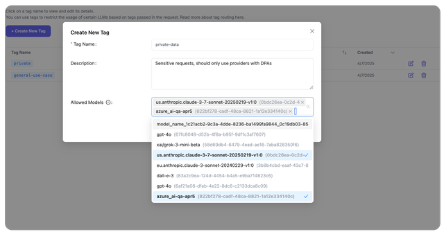 Create a tag called private-data and only select the allowed models for requests with this tag. Once created, you will see the tag in the Tag Management page.